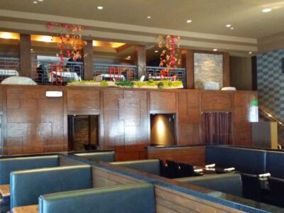 Modern steakhouse with cozy wood-beamed dining room featuring premium cuts like 40oz bone-in ribeye and fresh lobster tail. Open kitchen lets you watch chefs work while dim lighting and rich booths create intimate atmosphere perfect for anniversaries and special occasions.